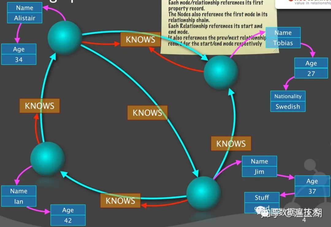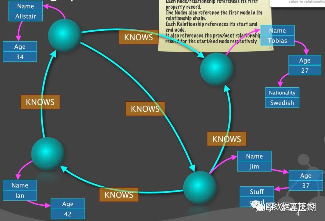 图中已经细分出了元数据、标签、点、属性、关系、关系类型和schema等不同类别的文件。文件众多,为了方便解释,我们仅分析点、关系和属性这三类。neo4j的点、关系和属性分别保存在neostore.nodestore.db、neostore.relationshipstore.db和neostore.propertystore.db文件中,看起来跟前述的按边切分,边跟点存储在一起的存储方式不同,而且属性也是单独的文件。那么问题来了,将点、关系和属性全部打散分开存储,是基于什么考虑呢,这样性能好得了吗?这正是neo4j特殊之处。