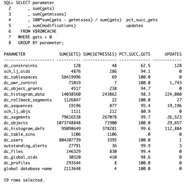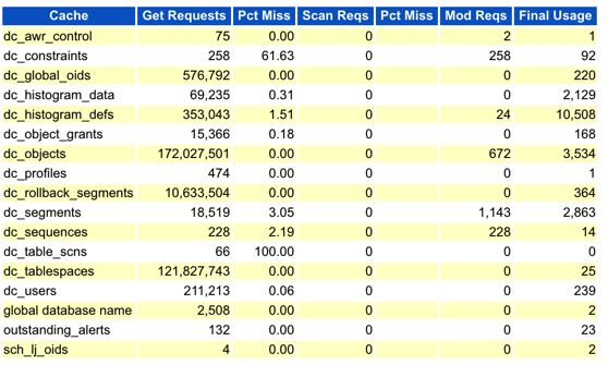 在AWR中DCS信息容易被忽略,但它往往却是异常的根本原因或直接证据,比如一些row cache、latch、enq、cursor的前台等待事件都是表象,而从DCS能够一眼看出问题所在。AWR中DCS相关的元数据存在dba_hist_rowcache_summary中,来源v$rowcache视图,详细如下: