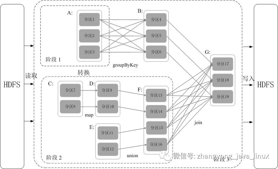 操作,得到分区13,这样流水线执行大大提高了计算的效率。RDD被分成三个Stage