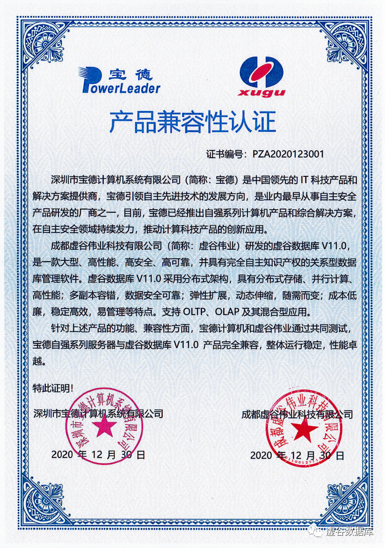 近日,成都虚谷伟业科技有限公司与深圳市宝德计算机系统有限公司共同通过测试,宝德自强系列服务器与虚谷数据库V11.0产品完全兼容,整体运行稳定。
