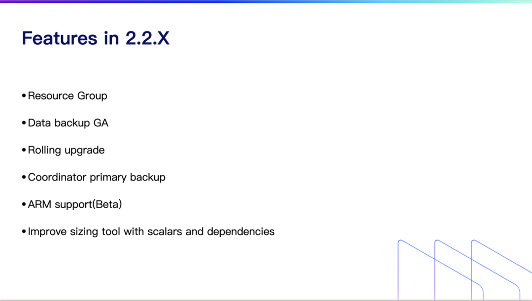 Resource Group,即物理资源的隔离; Data backup 工具,将正式进入 GA 阶段,用户可定时做数据的备份; Rolling upgrade,计划将 segment 做迁移,如此在升级的过程中用户的感知就会变得比较微弱; Coordinator 主备,目前功能已经 ready,欢迎大家试用; ARM 支持,后续版本将逐渐支持和完善; 优化 sizing tool; 2.3.0 版本计划新特性等。