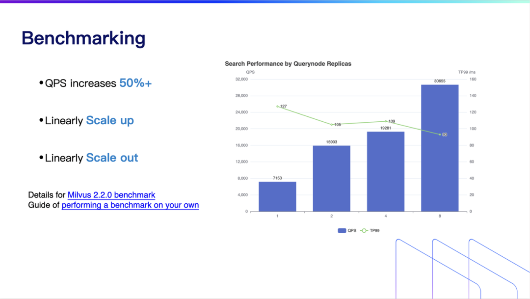 第一组测试为 2.2 和 2.1 版本性能的比较,可以发现平均的 QPS 测试性能提升了至少 50%,单机在 QPS 的性能提升更加明显,已经超过了接近 70%;第二组实验是关于 2.2 分布式纵向扩展的性能,结果显示在 CPU 翻一番的情况下,QPS 也增加了一倍,且响应时间变短;第三个实验是关于横向扩展。一个集群能否做横向扩展,对于 Milvus 能否上生产,做一些可扩展性是非常重要的,结果显示也是接近翻了一番。这和 Milvus 2. 1 相比是非常明显的提升。