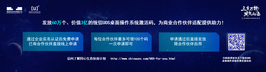 面向B端企业级市场,统信软件正式发布服务器操作系统UOS V20免费使用授权版本,并推出同心生态扶持计划,发放60万个、价值3亿的统信UOS桌面操作系统激活码,为商业合作伙伴适配提供助力。