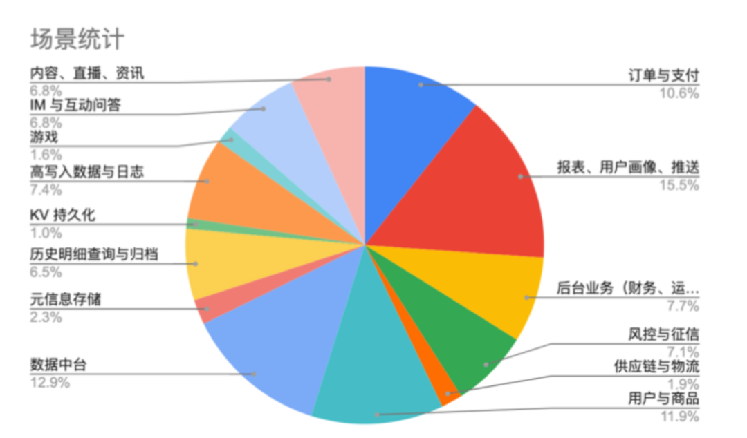 1、首先通过分类统计的方式,向大家真实展现了 TiDB 在广大用户使用现状;其中“报表、用户画像、推送”、“数据中台”;“用户与商品”、“订单与支付” 是使用最广泛的前四个场景。