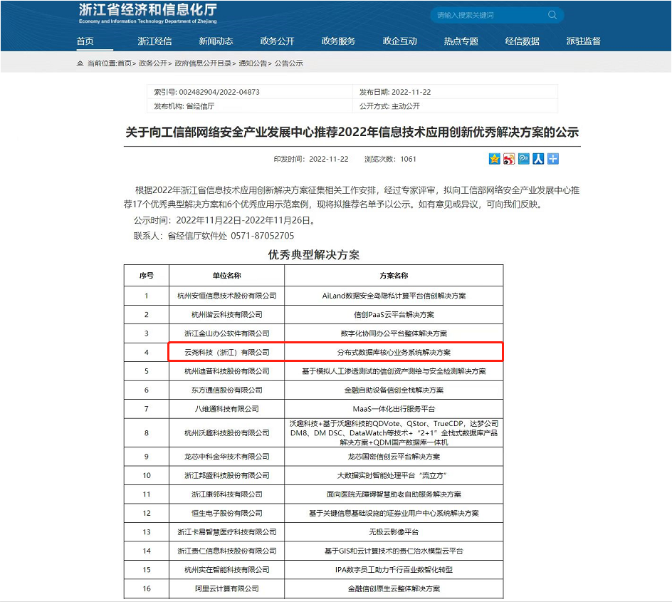 近日,云尧科技提交的“分布式数据库核心业务系统解决方案”成功入选浙江省经济和信息化厅2022年信息技术应用创新优秀典型解决方案,同时向工信部网络安全产业发展中心推荐。同时入选的还有来自阿里云、恒生电子、安恒信息、迪普科技等知名企业的优秀方案。