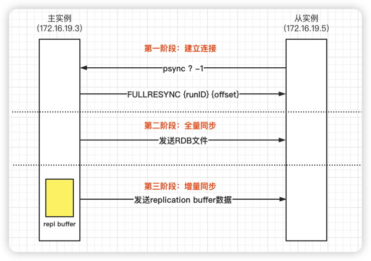 第一阶段:主从库间建立连接、协商同步的过程,主要是为全量复制做准备。具体来说,从库给主库发送 psync 命令,表示要进行数据同步,主库根据这个命令的参数来启动复制。psync 命令包含了主库的 runID 和复制进度 offset 两个参数。runID,是每个 Redis 实例启动时都会自动生成的一个随机 ID,用来唯一标记这个实例。当从库和主库第一次复制时,因为不知道主库的 runID,所以将 runID 设为“?”。offset,此时设为 -1,表示第一次复制。