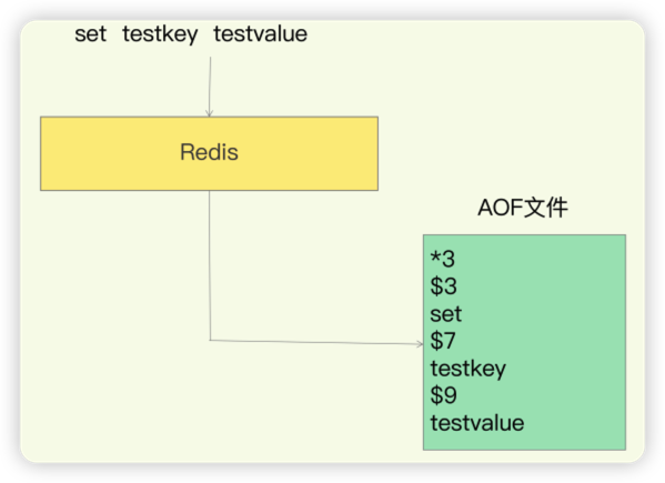 AOF 里记录的是 Redis 收到的每一条命令,这些命令是以文本形式保存的。我们以 Redis 收到“set testkey testvalue”命令后记录的日志为例,看看 AOF 日志的内容。其中,“ *3 ”表示当前命令有三个部分,每部分都是由“$+数字”开头,后面紧跟着具体的命令、键或值。这里,“数字”表示这部分中的命令、键或值一共有多少字节。例如,“$3 set”表示这部分有 3 个字节,也就是“set”命令。
