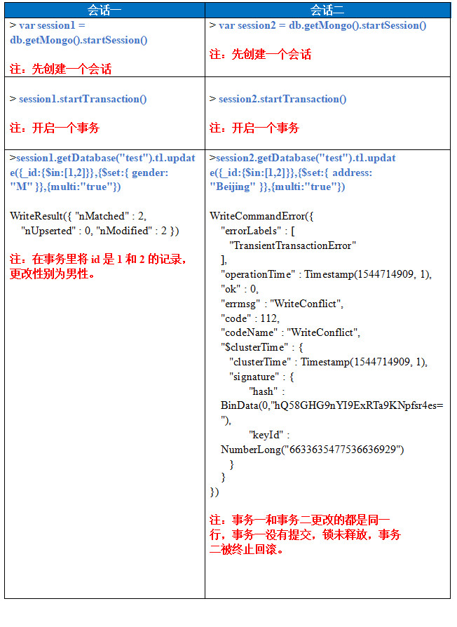 当两个(或多个)并发事务修改相同的文档时,会发生冲突。即使在尚未提交事务时,MongoDB也可以立即检测到冲突。
