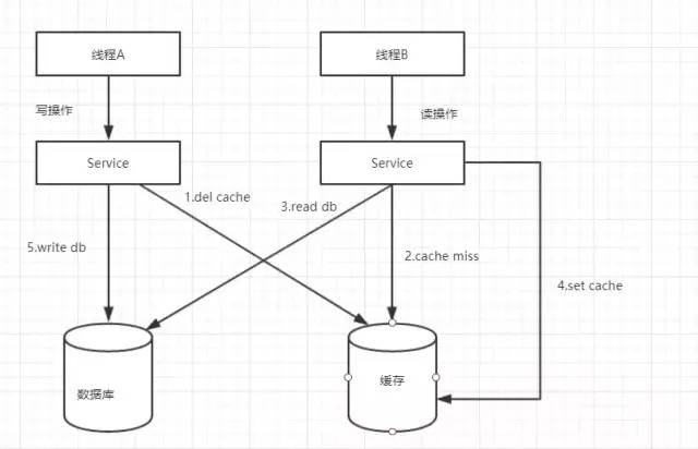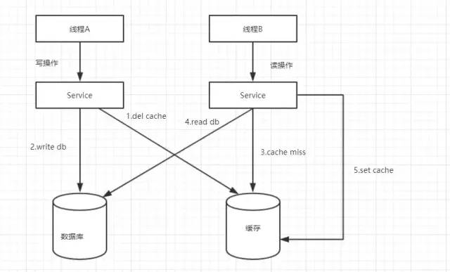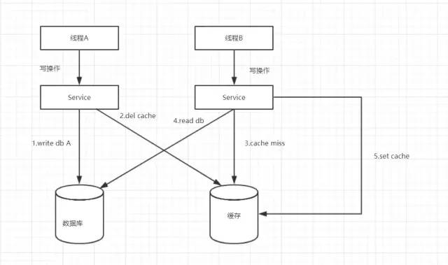 假设有一写(线程A)一读(线程B)操作,先操作缓存,在操作数据库。,如下流程图所示: