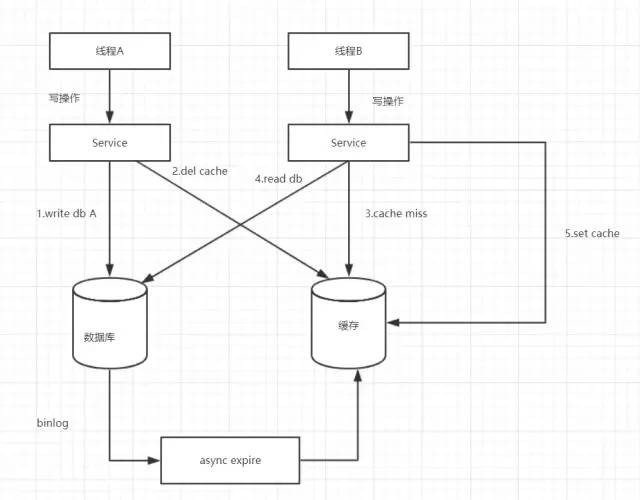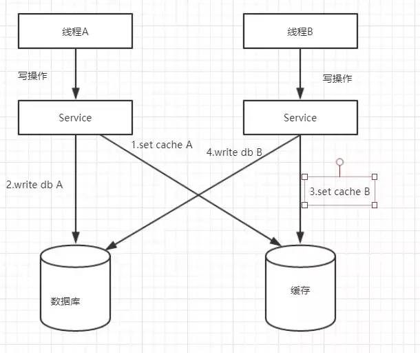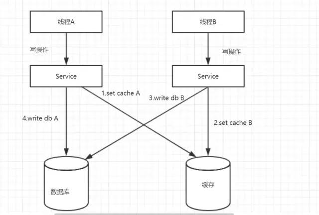 一写(线程A)一读(线程B)操作,先操作数据库,再操作缓存。