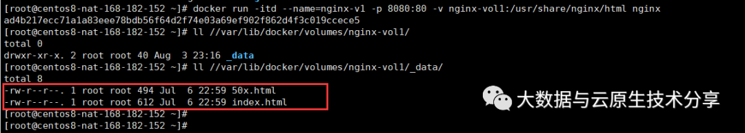 其中,-v代表挂载数据卷,这里使用自定数据卷nginx-vol1,并且将数据卷挂载到 usr/share/nginx/html。