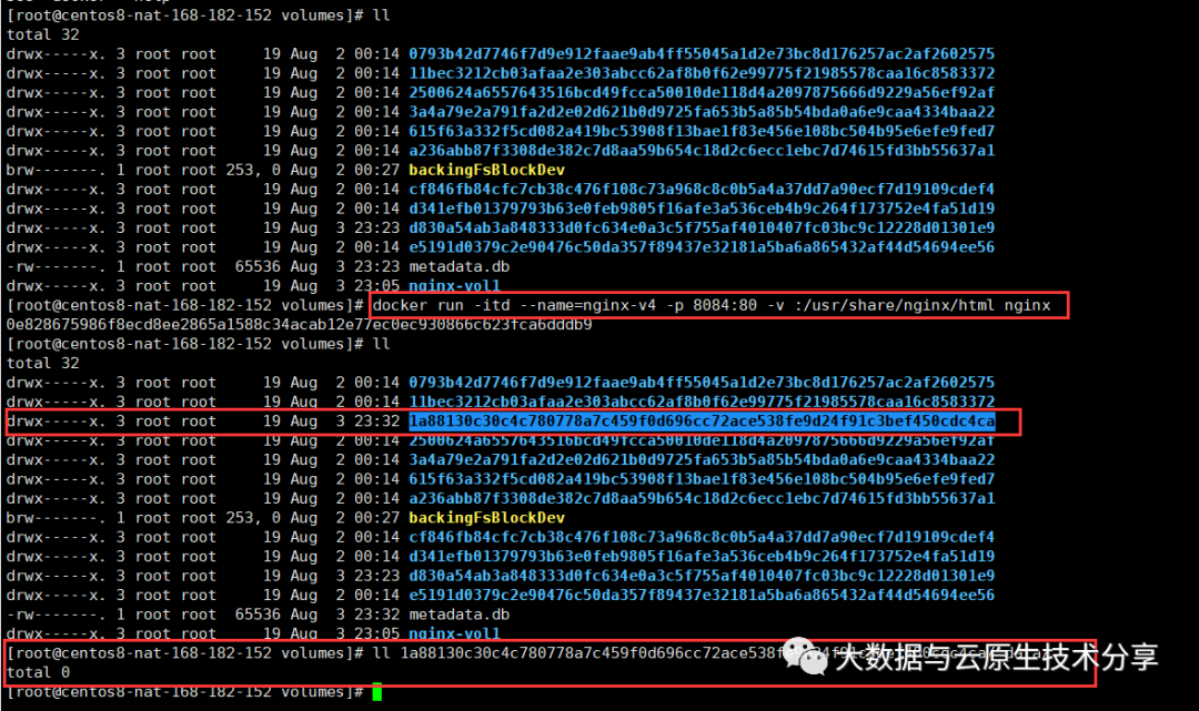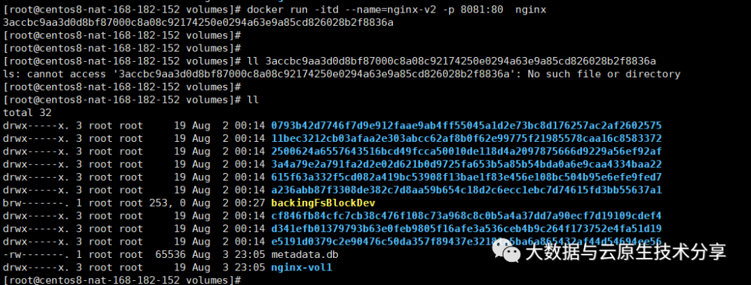 4.3、如果加-v,但是不指定宿主机的挂载目录,则会自动创建一个随机的挂载目录,这种方式是bind mounts,也看不到默认文件
