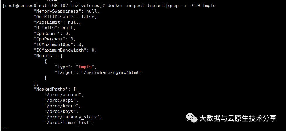 通过运行 docker inspect tmptest 来验证挂载是否是 tmpfs 挂载,查看 Mounts 部分: