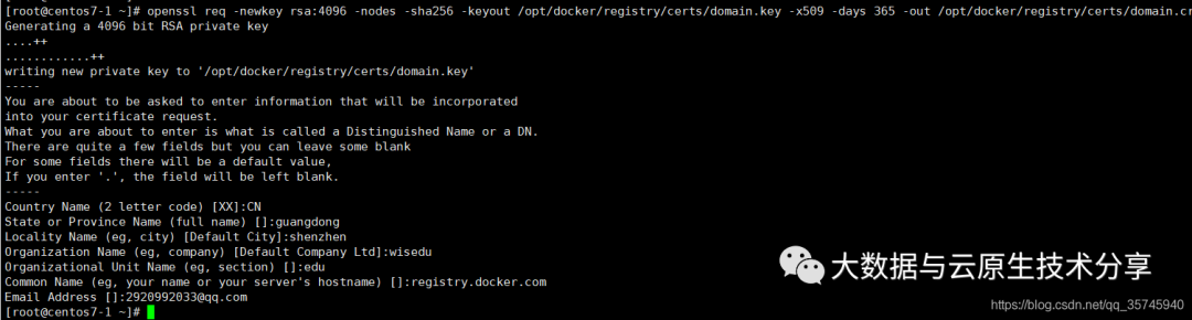 使用TLS认证registry容器时,必须有证书。一般情况下,是要去认证机构购买签名证书。这里使用openssl生成自签名的证书。
