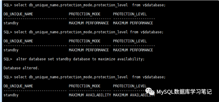 这个和最大保护模式不同的是,如果写入到Standby Database失败,Primary Database不会自动关闭。这时Primary Database会自动转换为Maxmium Performance模式,等待问题解决并且Standby Database再次和Primary Database同步之后,Primary Database会自动的转换为Maxmium Availability。