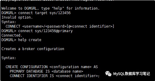 DGMGRL>create configuration dg as primary database is primary connect identifier is primary;