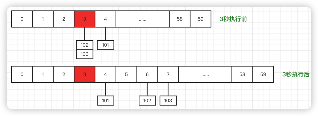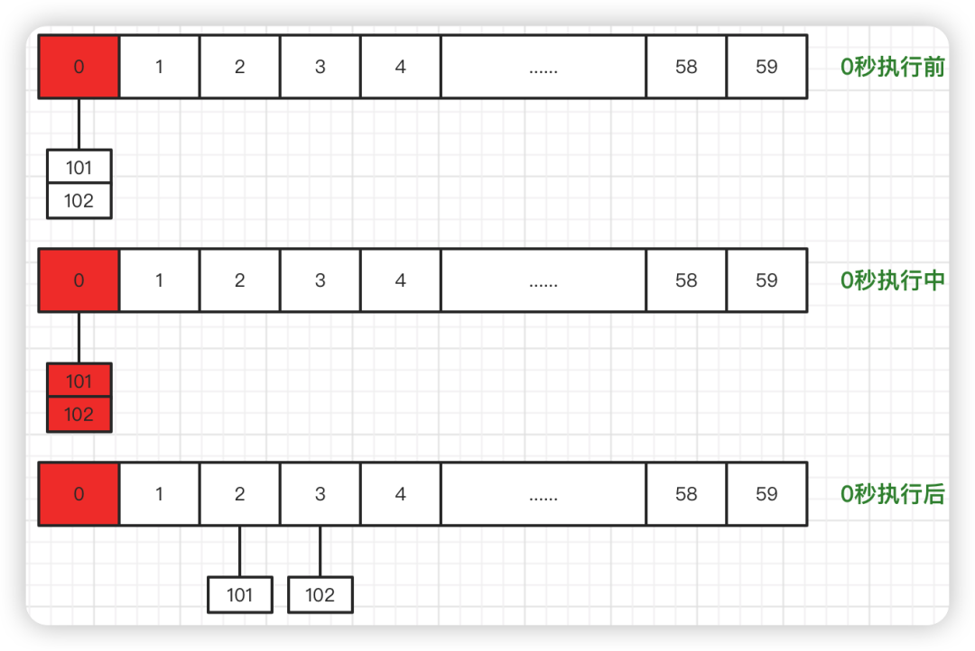 我以嘀嗒式秒针时钟为例,可以把时钟环看作一个数组,秒针 1~60 秒停留的位置作为数组下标,60s 为数组下标 0。假设现在有 3 个待执行的任务,分别如下: