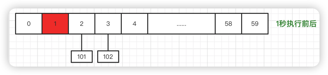 然后时间指针往前推动一个时刻,到了 1 秒时刻。此时刻时间轮中的任务并未发生变化。