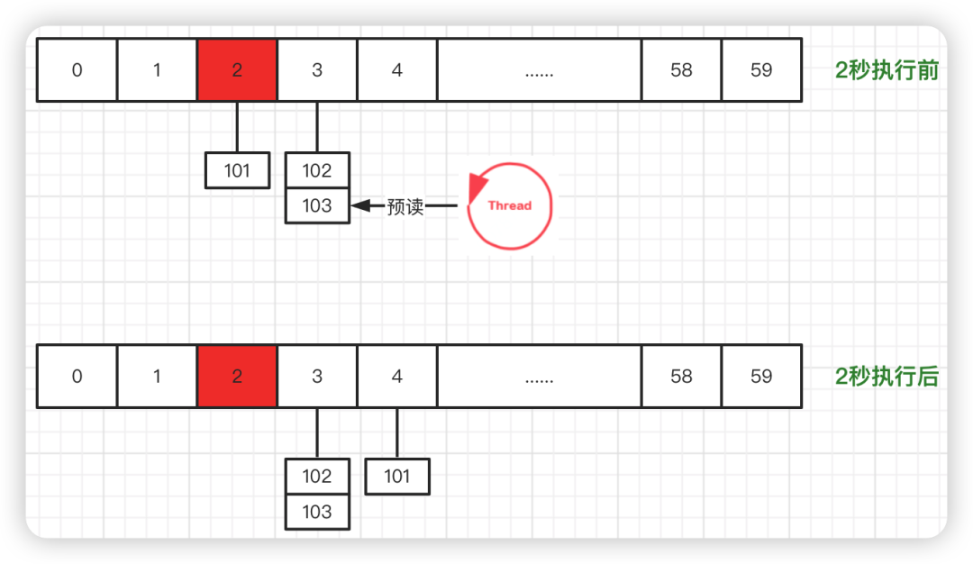 到了第 2 秒时刻,预读线程将 jobid 103 加入时间轮,并执行该数组下标下的任务: