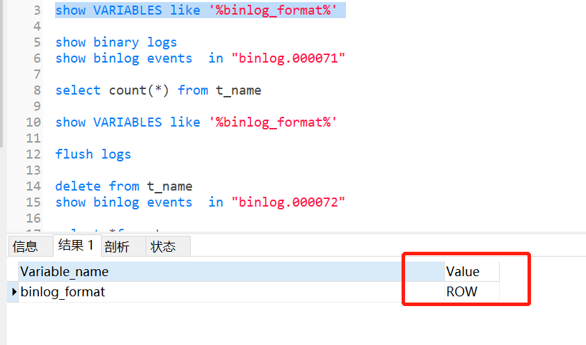解析之前需要查看binlog 格式,默认情况下建议生产环境全部采用ROW格式