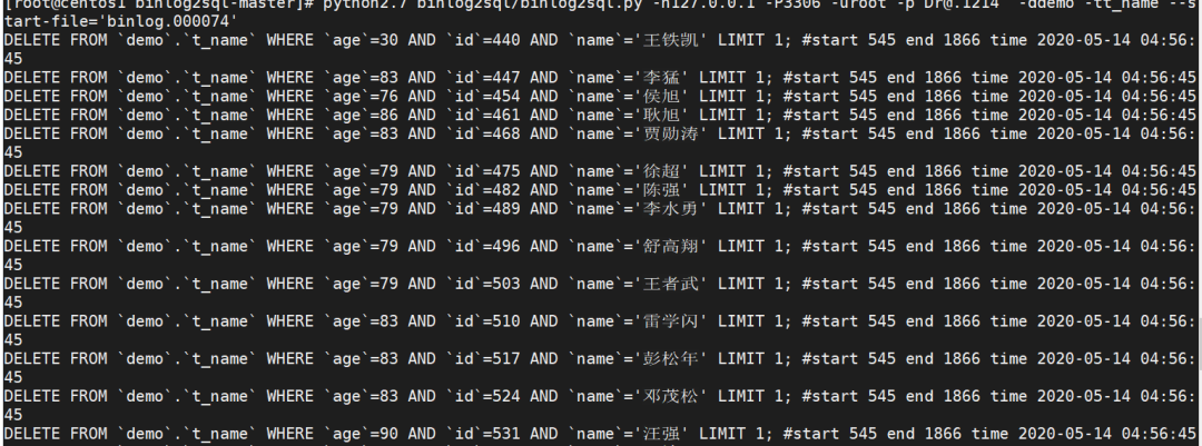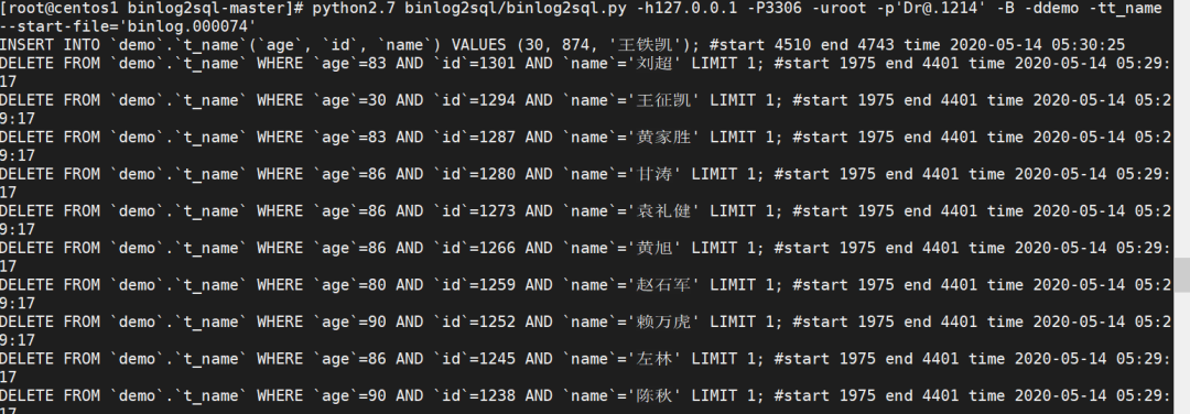 python2.7 binlog2sql/binlog2sql.py -h127.0.0.1 -P3306 -uroot -p'Dr@.1214' -ddemo -tt_name --start-file='binlog.000074'
