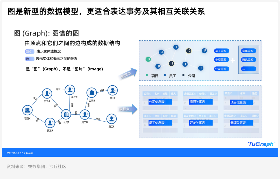 图数据库的图是Graph、而非Image。图是新型的数据模型,更适合表达事务及其相关互联关系。例如员工在公司工作这一场景,由关系型数据库表达需要多张表,包括公司信息表、员工信息表、项目信息表、参项关系表、好友关系表等,而由图数据库表达就是点和边。