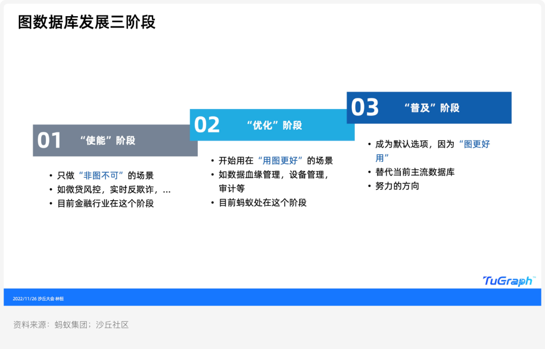 第一阶段,“使能”阶段。将图数据库应用于“非图不可”的场景,例如安全风控、实时反欺诈等,如果不用图处理会非常复杂,当前金融行业正处于这一阶段。