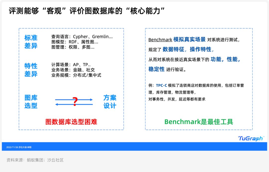 图数据库选型时存在查询语言、图模型、图关联等标准差异及计算场景、业务场景、业务规模等特性差异,且图库选型的结果往往不完全等价于方案设计。基准测试是选型的最佳工具,通过模拟真实场景对系统进行测试,规定了数据特征、操作特性,从而对系统在接近真实场景下的功能、性能、稳定性进行验证。