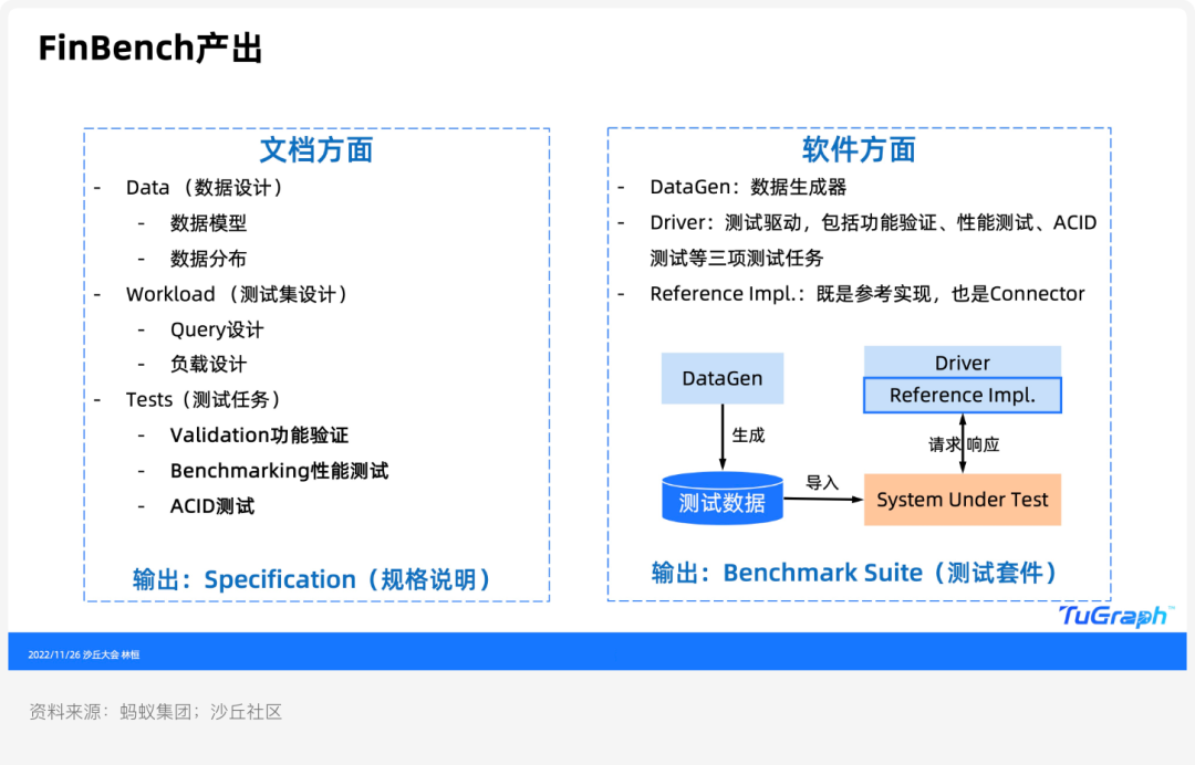 FinBench的产出物分为文档和软件两个方面。文档方面输出Specification(规格说明),包括功能验证、性能测试和ACID测试;软件方面输出Benchmark Suite(测试套件),包括DataGen生成测试数据,导入到系统中,在Driver里完成功能验证、性能测试和ACID测试三项测试任务。