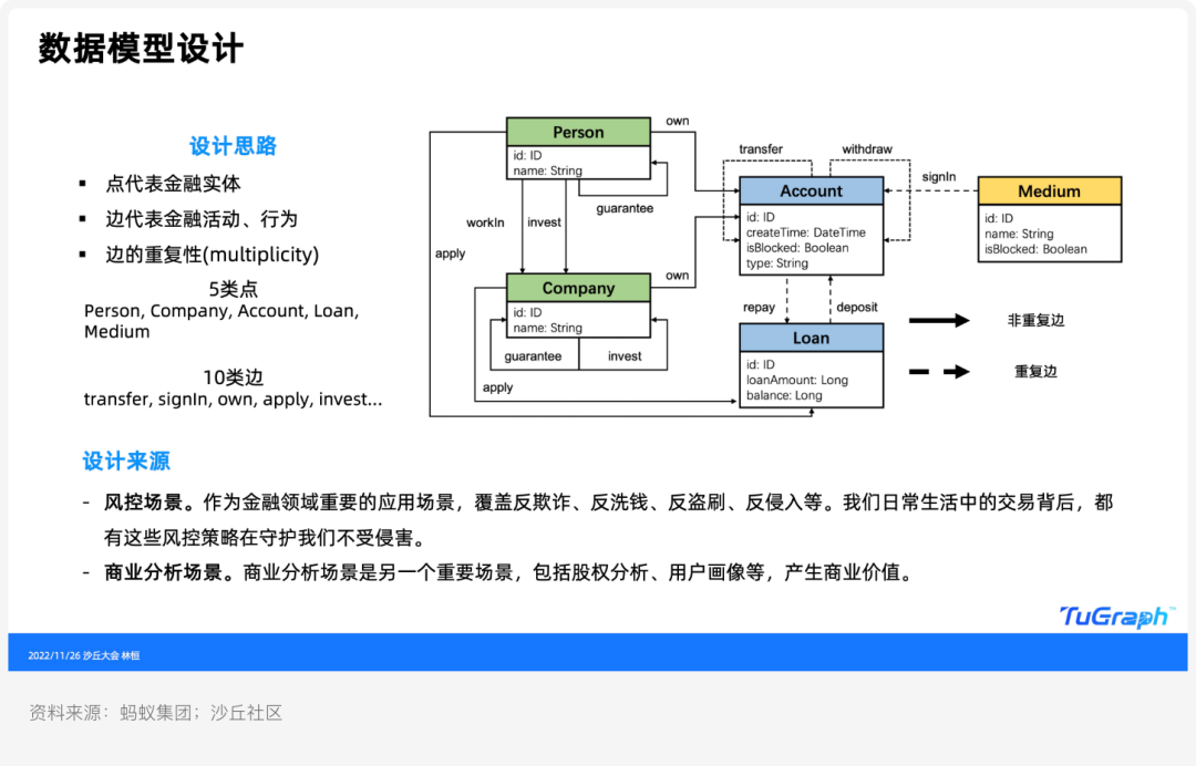 数据模型的实际思路是用点代表金融实体,边代表金融活动、行为,覆盖风控场景和商业分析场景。风控场景是金融领域重要的应用场景,包括反欺诈、反洗钱、反盗刷、反侵入等;商业分析场景是另一个重要场景,包括股权分析、用户画像等。