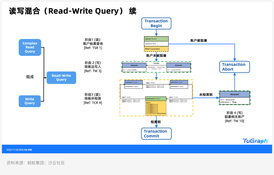 其中,读-写查询是金融场景较为独特的查询方式,用于简化风控链路。读查询包括账户属性查询、三度转账环计策等,写查询包括写入转账边、账户标黑等。由读查询和写查询复合在一起的读-写查询是更加复杂的场景,例如先读查询判断账户是否被标黑,如果账户未被标黑则写查询加一笔转账交易,然后读查询进行转账环检测,如果检测到环,则说明交易可能存在洗钱行为,拒绝该笔交易,如果未检测到,说明是合法交易,则执行写查询阻塞相关账户。一个复杂行为就是一个transaction,对图数据库提出能力要求。