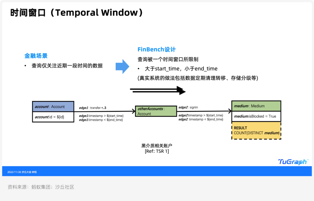 大部分金融交易具有时间属性,查询仅关注近期一段时间的数据,对图数据库提出时间窗口的要求,FinBench设计查询被一个时间窗口所限制。