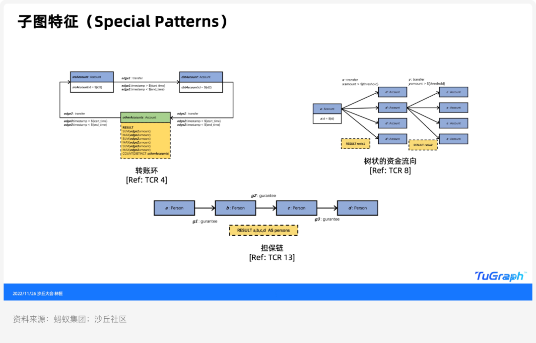 金融场景有一些常见的子图特征,例如转账环、树状的资金流向、担保链等。