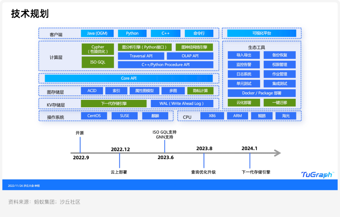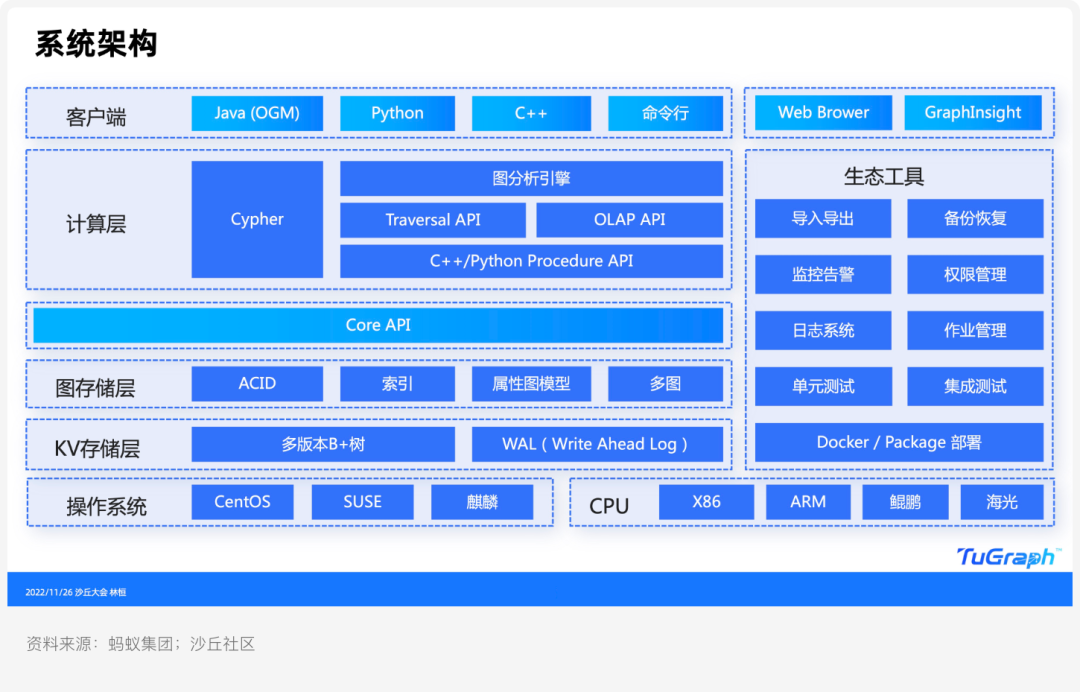 在系统架构方面,TuGraph是一个较为完备的数据库,操作系统可以是常见的CentOS、SUSE,也可以是麒麟等国产数据库,CPU方面支持X86、ARM等,也支持国产鲲鹏、海光等。在KV层之上做图存储层,提供图的语义。图查询语言使用Cypher(类似于GQL),也提供C++/Python的Procedure API,实现精细控制。客户端提供Java(OGM)、Python、C++以及可视化交互页面。