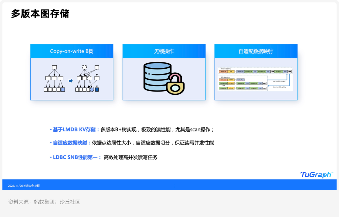 在图中有很多scan操作,读取一个点所有的边和属性,如果做的太离散,会导致随机跳转太多,影响性能。TuGraph使用多版本B+树实现图存储,无锁操作,大部分读操作不受写操作的影响,B+树的问题是写操作稍微慢一些,对此,TuGraph通过切分的方式保证性能。图的点边到KV的映射是自适应的,所有属性和点放在一个value中,通过自适应映射保证数据不会变得特别长。