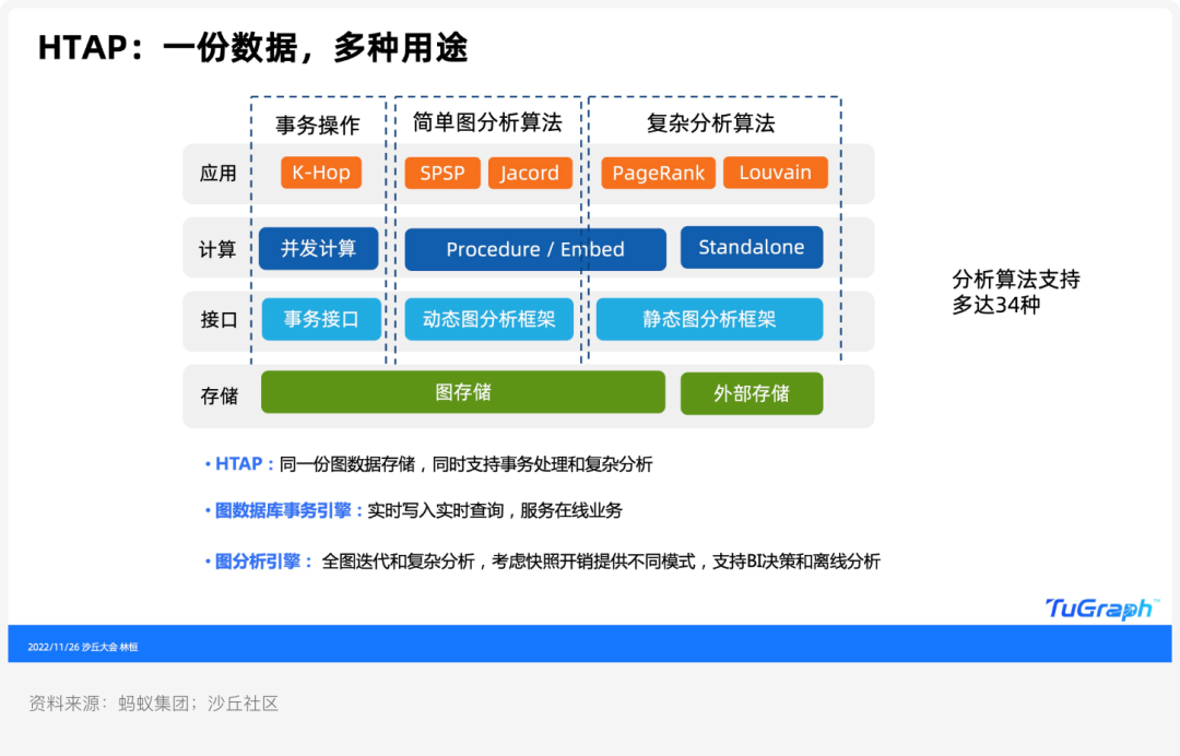 分析有复杂分析和简单分析,对于简单图分析,例如两点之间最短路、Jacord等,直接用图存储,用动态分析框架做;对于复杂分析,例如PageRank、Louvain等,重新起一份数据,尽量数据压缩,加速复杂分析。