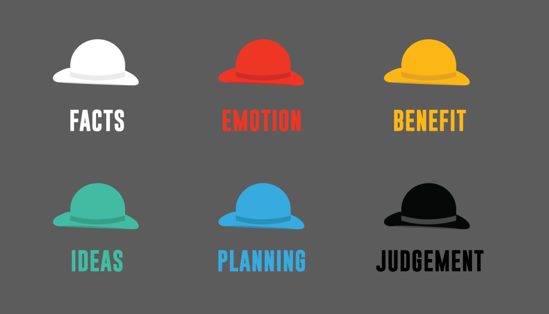 白色思考帽——中立而客观,代表信息、事实和数据 红色思考帽——感性与主观,代表预感、直觉和印象 黑色思考帽——批判与怀疑,识别风险 黄色思考帽——阳光与乐观,代表事物合乎逻辑性、积极性的一面 绿色思考帽——创意与灵感 蓝色思考帽——全局、结构与战略