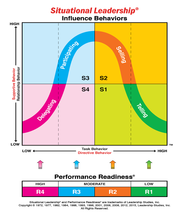 指挥式——当处于关键时期或者团队士气低落的时候。 授权式——在基本不需要管理的情况下,团队能够完成任务。 支持式——彼此信任,且团队成员之间能够互相支持。 教练式——团队中的某个成员可能需要重点关注和支持,帮助其建立信心的情况。