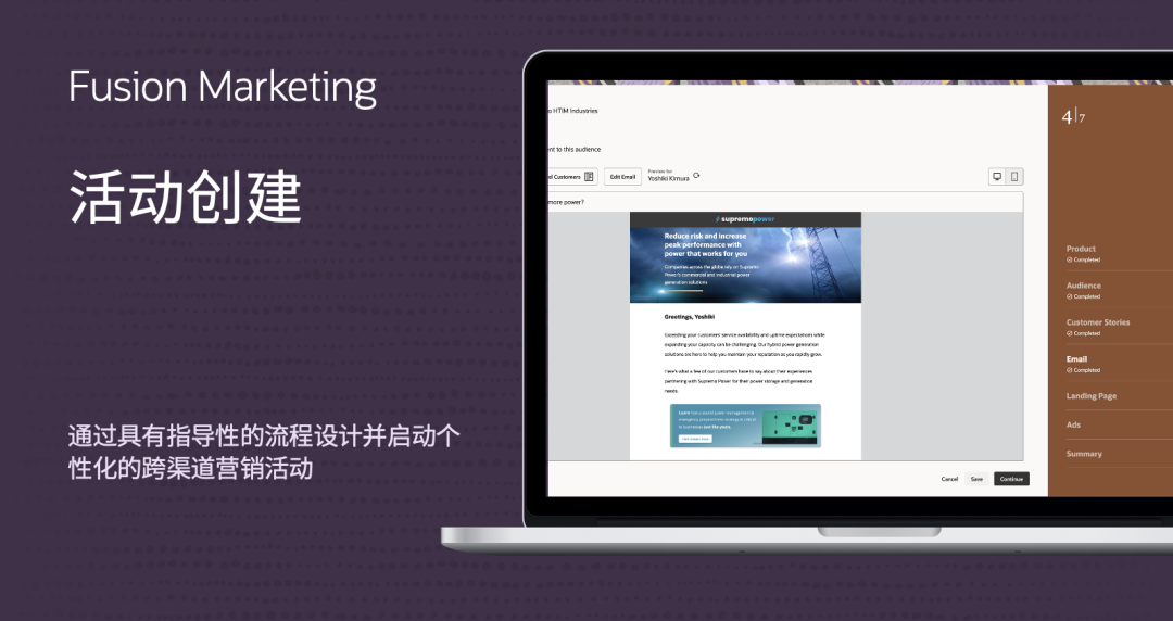 Oracle Marketing 解决方案的愿景是将所有各个细分点的体验整合到一个平台中,包括创造与获得一个机会、从客户数据平台(CDP)中获取第一方数据、在付费、自有和广告等渠道中创建各种活动、以结构化的方式使用分析数据来培育和教育客户和潜在客户,以及利用分析将客户体验贯穿始终。