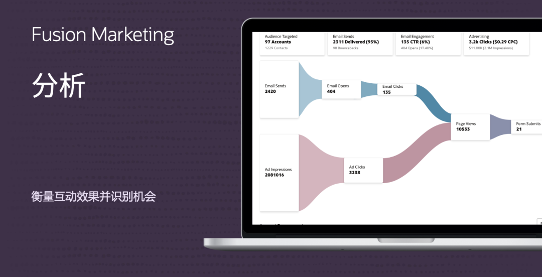 MQL 在转化成机会的过程中总是存在一些障碍,比如销售团队不信任 MQL 的数据,觉得没有必要跟进。因此,团队需要从营销漏斗的顶端入手解决这些问题。团队需要了解目标客户是谁,从哪里来?深入了解他们的粘性与意图,将潜在的购买群体具象化,然后再给到销售人员进一步跟进。Oracle Marketing 的分析模块可以帮助营销和销售人员进行更好的客户数据分析,建立适合的判断标准及客户画像,提高数据可信度。