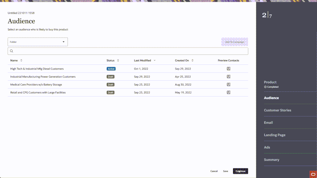 第一步从创建活动开始,然后选择目标受众 (Audience)。受众是已经在 Unity 中创建好的,用户能够基于来自 ERP 的信息,以及推广者评分,情绪及偏好,消费水准等数据去圈定目标,轻松地将他们添加到活动中。