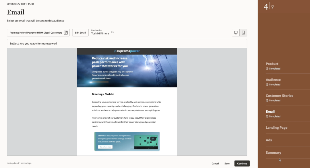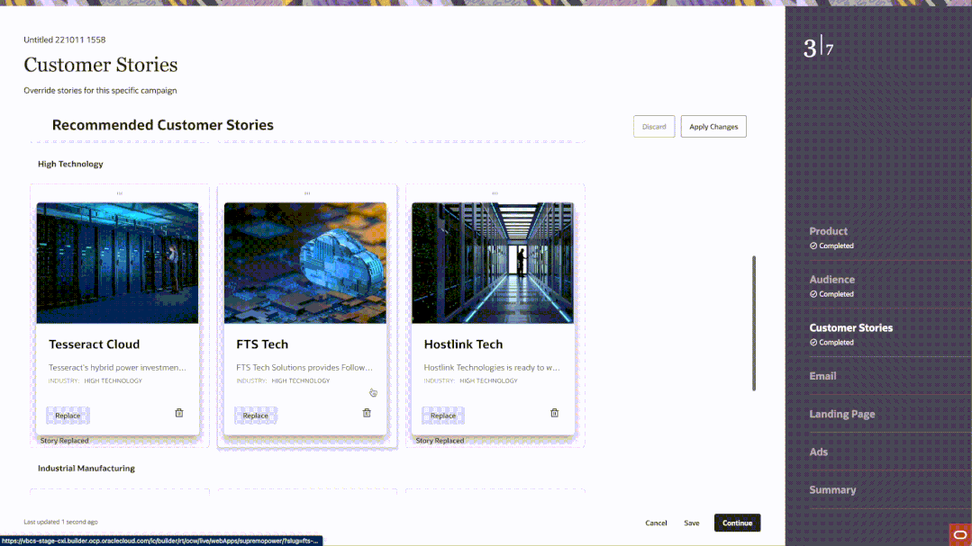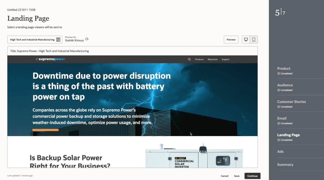 点击电子邮件的横幅(Banner),能进入一个落地页(Landing Page)。用户可以通过 Oracle 内容管理模块(Content Management)来预先配置落地页,而落地页的内容则可以和行业故事,涉及到的产品内容和解决方案介绍紧密结合。
