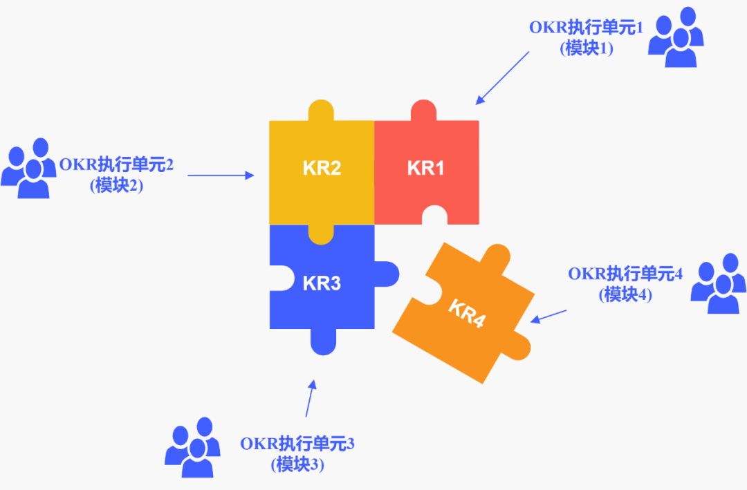 每个模块会任命一个负责人(我们称之为SE),SE对模块的结果负责,即具体KR的执行者。团队的管理者对整个O负责,从整体上跟踪OKR的进展。虽然每个模块“各自为营”,却有共同的目标。这种基于OKR的模块化分级组织,可以提升整个团队的OKR执行效率。既能保证模块内成员目标明确,又能保证整个团队形成合力,可以集中力量办大事!