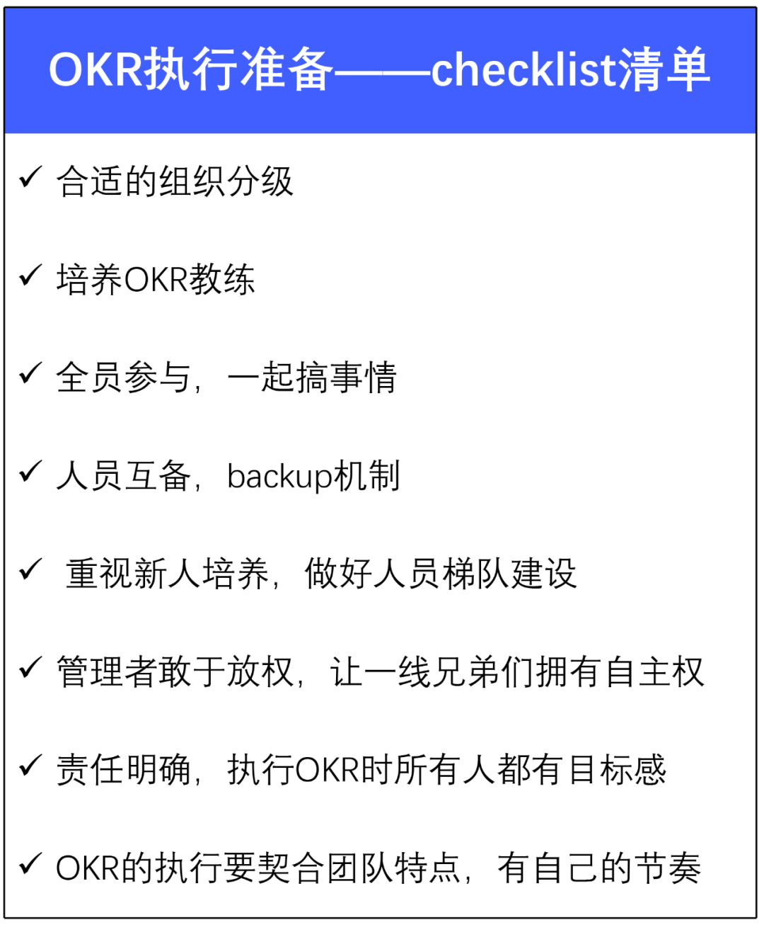 适百里者宿舂粮,我们建议每个团队在OKR执行前,都做好相应的准备热身。趁热打铁,我们还精心准备了一份checklist清单,便于执行OKR的团队快速热身。