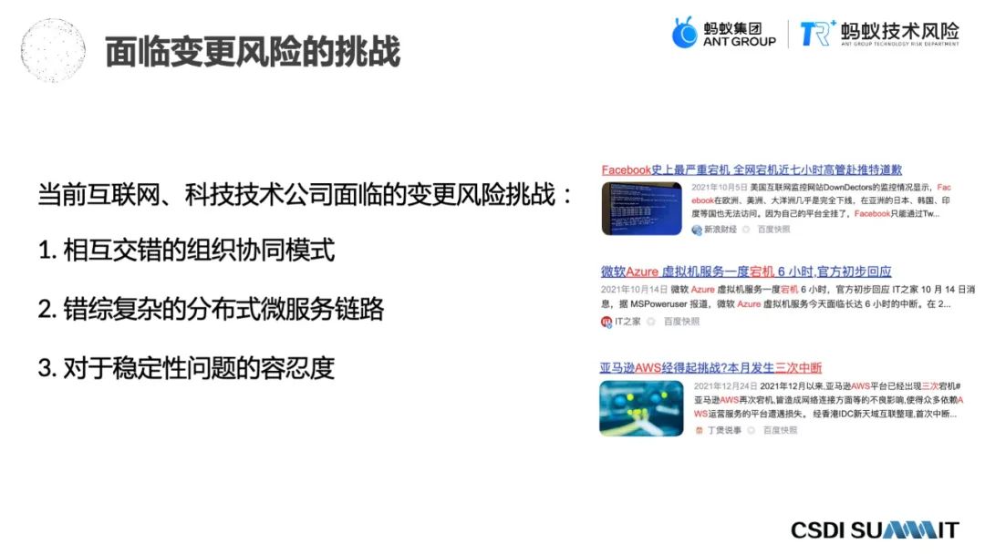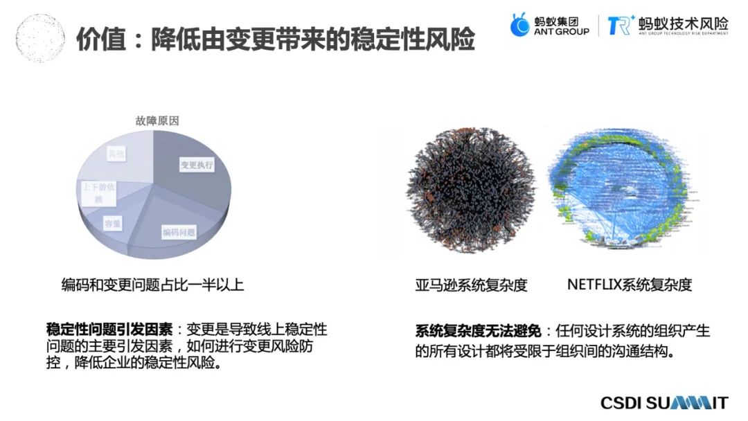同时,整个系统的分布式复杂度是越来越高的,任何系统设计都依赖于组织间的关系,这是符合康威定律的,就是组织架构决定生产关系。所以像亚马逊、NETFLIX,包括蚂蚁集团,整个系统的复杂度也是会逐渐升高的,随着业务的发展和组织逐渐的扩大,对于变更的问题也会尤其严重。