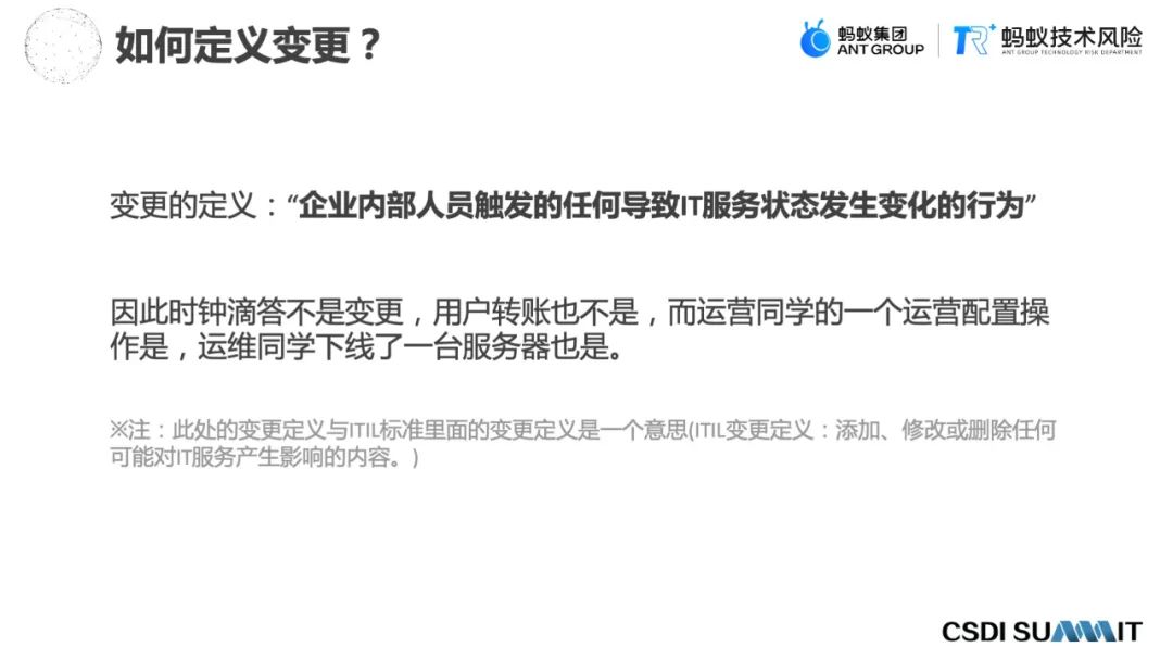 变更在这里的定义,跟ITIL V4标准里面的变更定义差不多一个意思,ITIL里面的定义是“添加、修改或删除任何可能对IT服务产生影响的内容”。这里增加了一个定义,“是由企业内部人员”,因为往往变更的操作,不会开放给企业外部人员,所以我们的定义是“企业内部人员触发的任何导致IT服务状态发生变化的一些行为”,这个含义和ITIL的标准是一致的。这是怎么去定义变更。