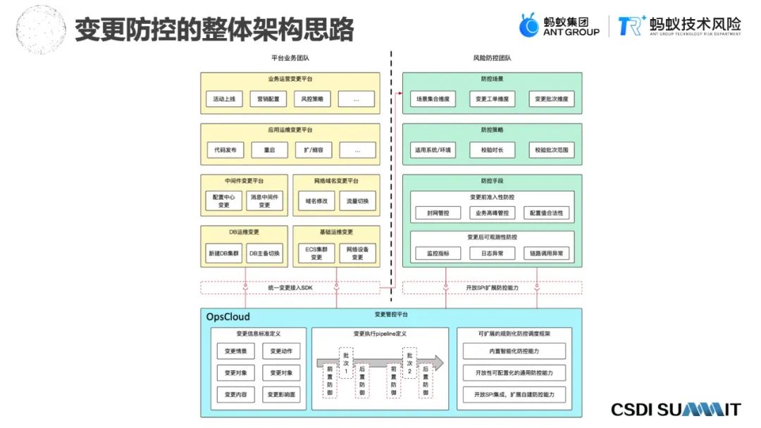 这是整个变更的架构思路,第一方面是通过一个接入的SDK,把变更平台的变更事件通过这个SDK接入进来,然后把信息标准化,把执行的pipeline标准化定义出来。第二方面就通过开放的SPI扩展能力,把后面风险防控团队做的一些防控的事情,比如业务高峰期的管控、变更后的可观测性的监控指标、日志异常、链路调度异常等等,做一个技术化的防控手段。这是整体的技术架构的思路。
