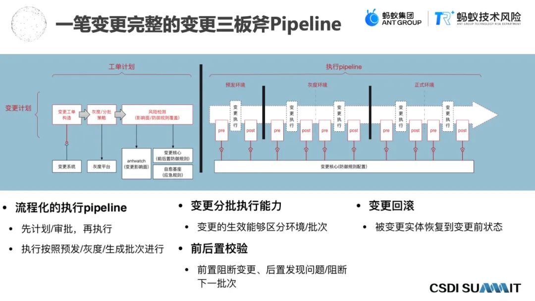 变更防御是在整个变更执行期间,有一个变更防控的三板斧pipeline,这个pipeline会在变更执行分批阶段做前后规则的实时校验,这个实时校验会及时发现这个变更对于线上生产环境、系统、业务上的一些影响,如果发现有任何异常,会实时地做异常的阻断,让这个变更能做自动的停止。
