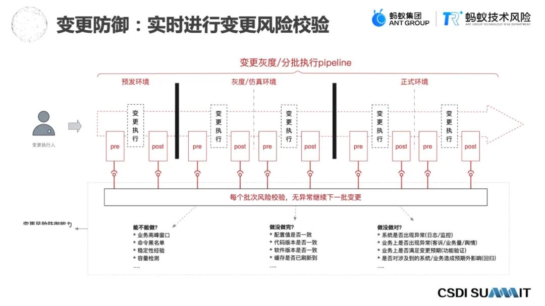 这是在变更防控三板斧的基础上,对于变更的执行阶段,每个前后置,每个阶段进行每个批次的风险校验,如果发现有风险,就会阻断这个变更往下执行。严重的情况下,会直接让这个变更回滚、自愈,规避变更对于线上已经产生的风险。如果没有异常,就会继续进行下一批的变更,直到这个变更逐步在生产环境执行完成。这是变更防御对于变更风险的实时校验。