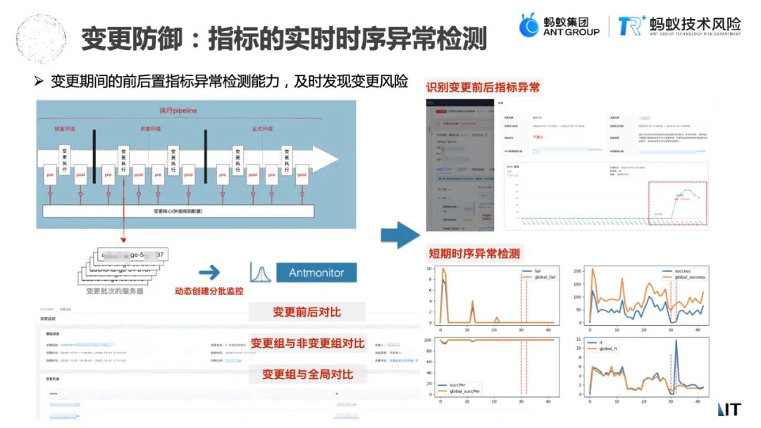 第一个是在变更防御场景下,我们做了一个实时指标时序异常检测的能力,这个能力会在整个变更期间,对于变更执行,比如发布的多少台服务器,针对这个批次的执行服务器去动态创建实时监控的指标项。可能这些指标项既包含了系统化的指标,像常见的CPU、Load、memory,也会包含一些微服务化的指标,像Ops调用、消息事件、订阅关系等等,也会对系统打data日志进行实时的监控。